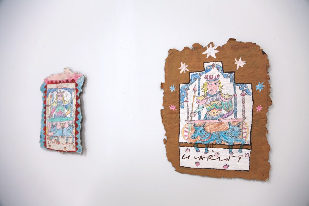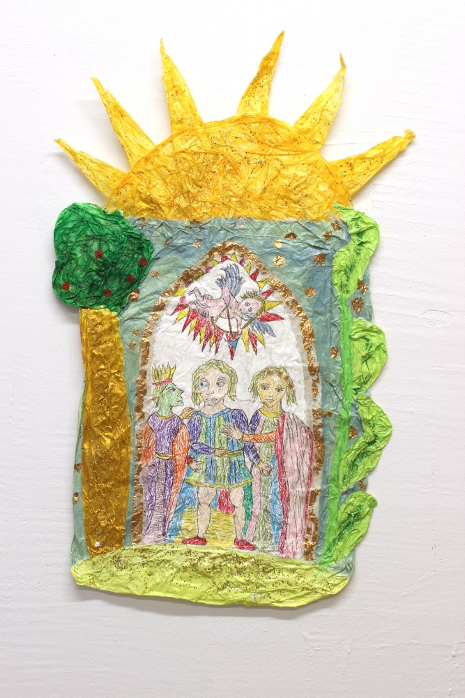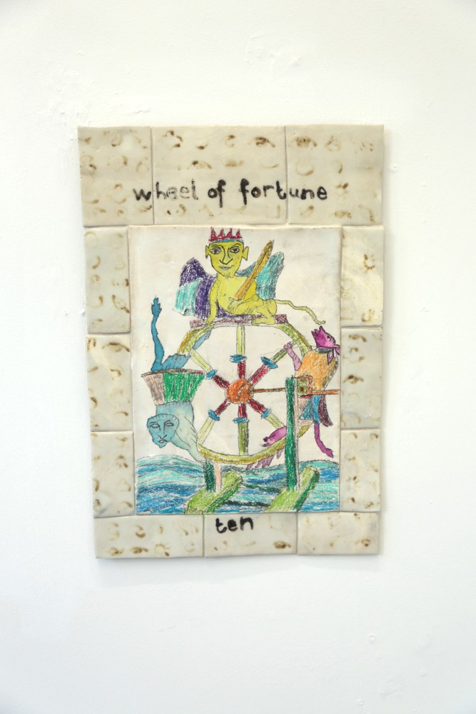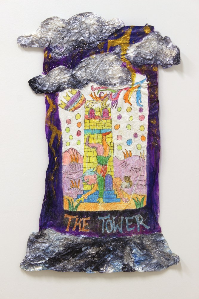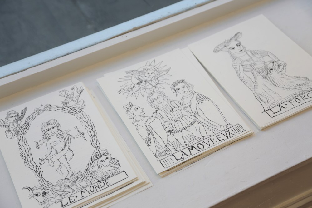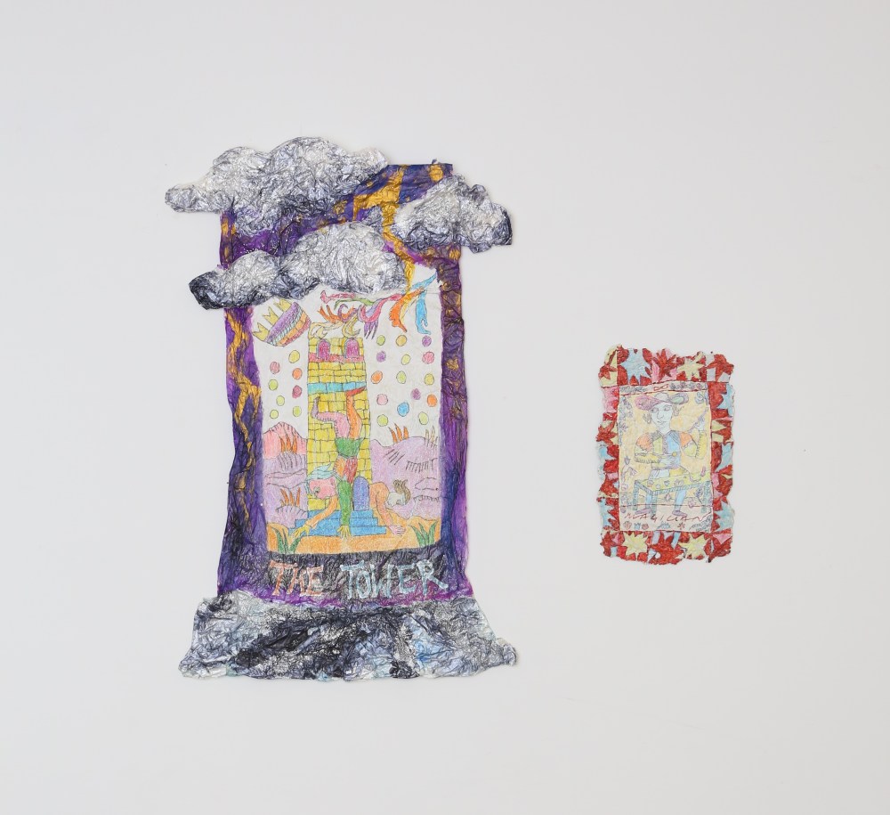 ‘As a response to the lockdown of 2020 I began a postal collaboration with artist Connie Hurley. Both sharing an interest in Tarot, an idea emerged that we should make Tarot cards together. At the time I was researching and writing about the Tarot for my blog ‘when we see you’ and felt like approaching the cards from a more embodied, tactile way by drawing them. I asked Connie to make me a card with hand made paper, and to interpret the sides of the card in anyway she felt like, leaving a blank space in the middle for me to draw the final image. The resulting card is a playful interaction between two artists, seeing each-other, sharing a space in the mysterious world of a Tarot card. ´